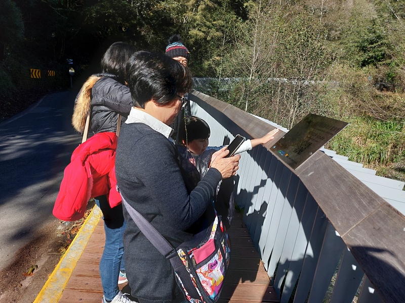 遊客在七家灣溪觀魚平台,以手機掃描告示牌上的QR Code,就能即時觀看國寶魚水中實境秀。遊客實際體驗用手機掃了QR Code後,看到水下鮭魚的即時動態影像,紛紛驚嘆科技的神奇,也覺得十分有趣。雪管處表示,目前先擇一定點做效果測試,若成效良好,未來不排除規劃更多地點,分享更多元的影像成果。