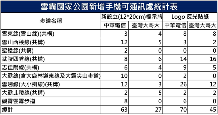 雪霸國家公園管理處(下稱雪管處)表示,近年配合山林開放政策及提升山區通訊服務品質,與中華電信及臺灣大哥大等電信業者合作,完成園區內九九山莊、中霸山屋等山區共構基地台。去(110)年就園區主要登山步道及周邊遊憩區森林步道進行手機訊號品質檢測,包含觀霧遊憩區的林間步道、熱門登山路線之雪山線、武陵四秀線或荒野型路線之大霸北稜,並新增可通訊牌示共90面,以方便登山民眾掌握沿途可通訊地點,也落實優化山區整體通訊服務品質的目標。