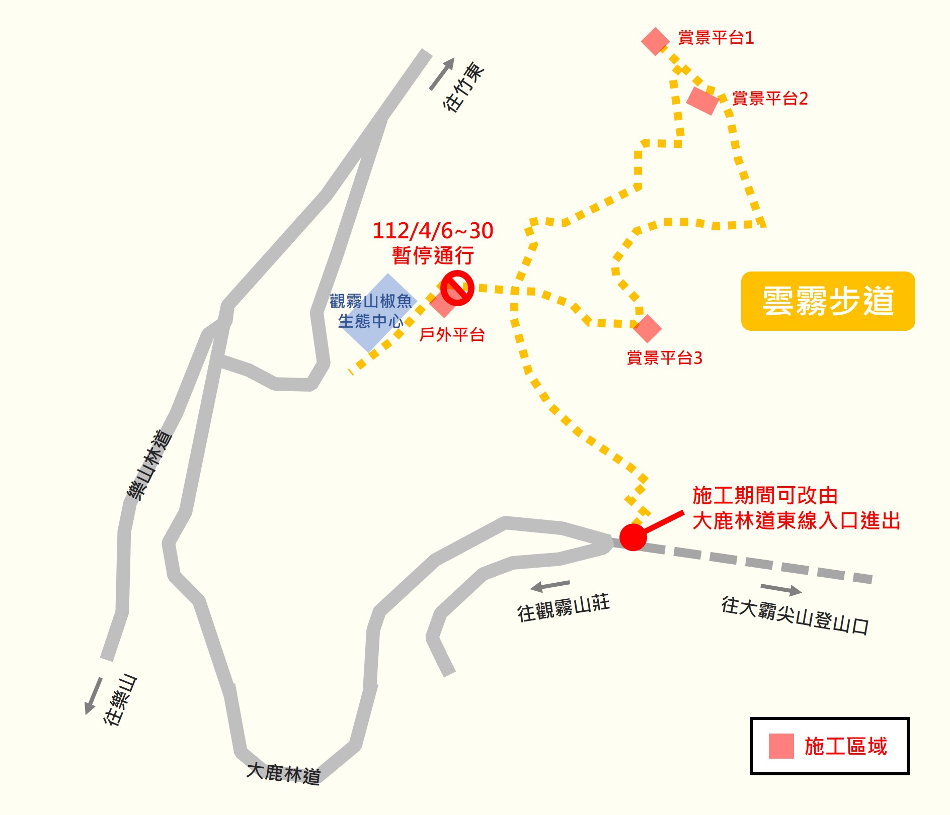 觀霧山椒魚生態中心(觀霧管理站)後方戶外平台預計於今年4月6日起至30日止暫停通行,施工期間請改由大鹿林道東線入口處進出。若因天候等因素影響,延長或改變施工日期,將另行公布。其餘各平台施工未影響步道通行,行經施工路段時請注意安全,造成不便敬請見諒。