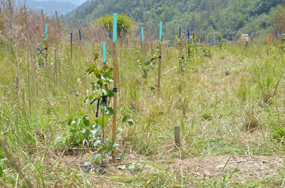 圖4 種植後立竹竿並將苗木綁於竹竿上,可以標示及固定苗木。