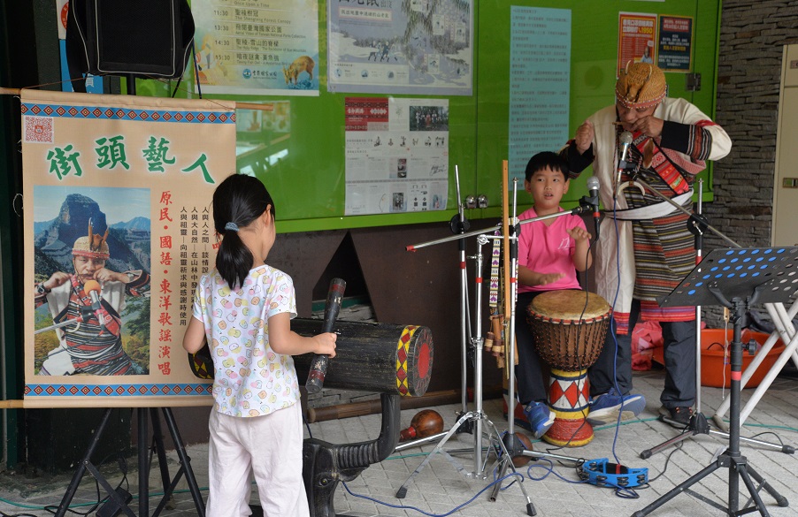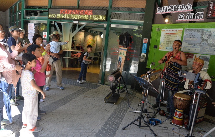 邀請雪見周邊司馬限部落泰雅族街頭藝人梁玉水至雪見遊客中心定點表演,演唱原住民古調歌謠,曲目間搭配泰雅口簧琴、非洲鼓、木箱鼓及排鈴表演。
